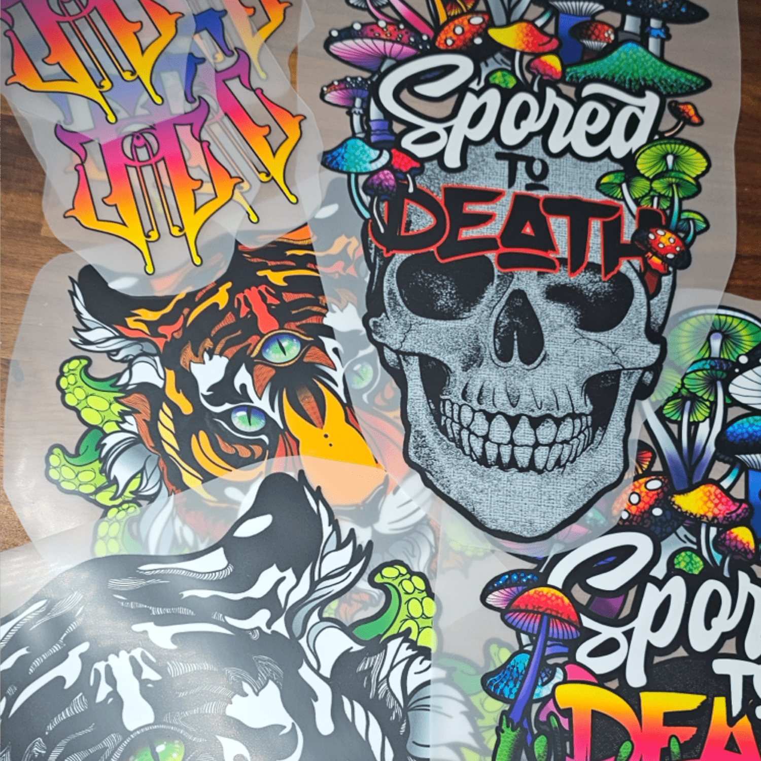 I use a high-quality print created with Direct-to-Film (DTF) transfers and HTV vinyl. using a heat press to apply to your garment for a super-vibrant, long-lasting finish. Each piece is a unique expression of my creative style, showcasing my own custom artworks, not the mass produced clip art that’s flooding the market.