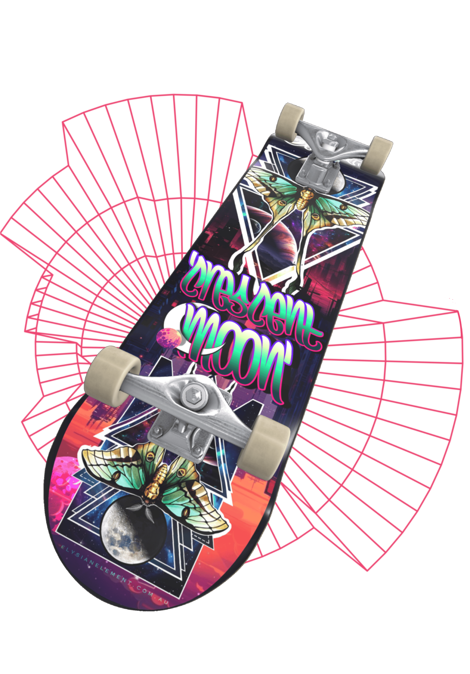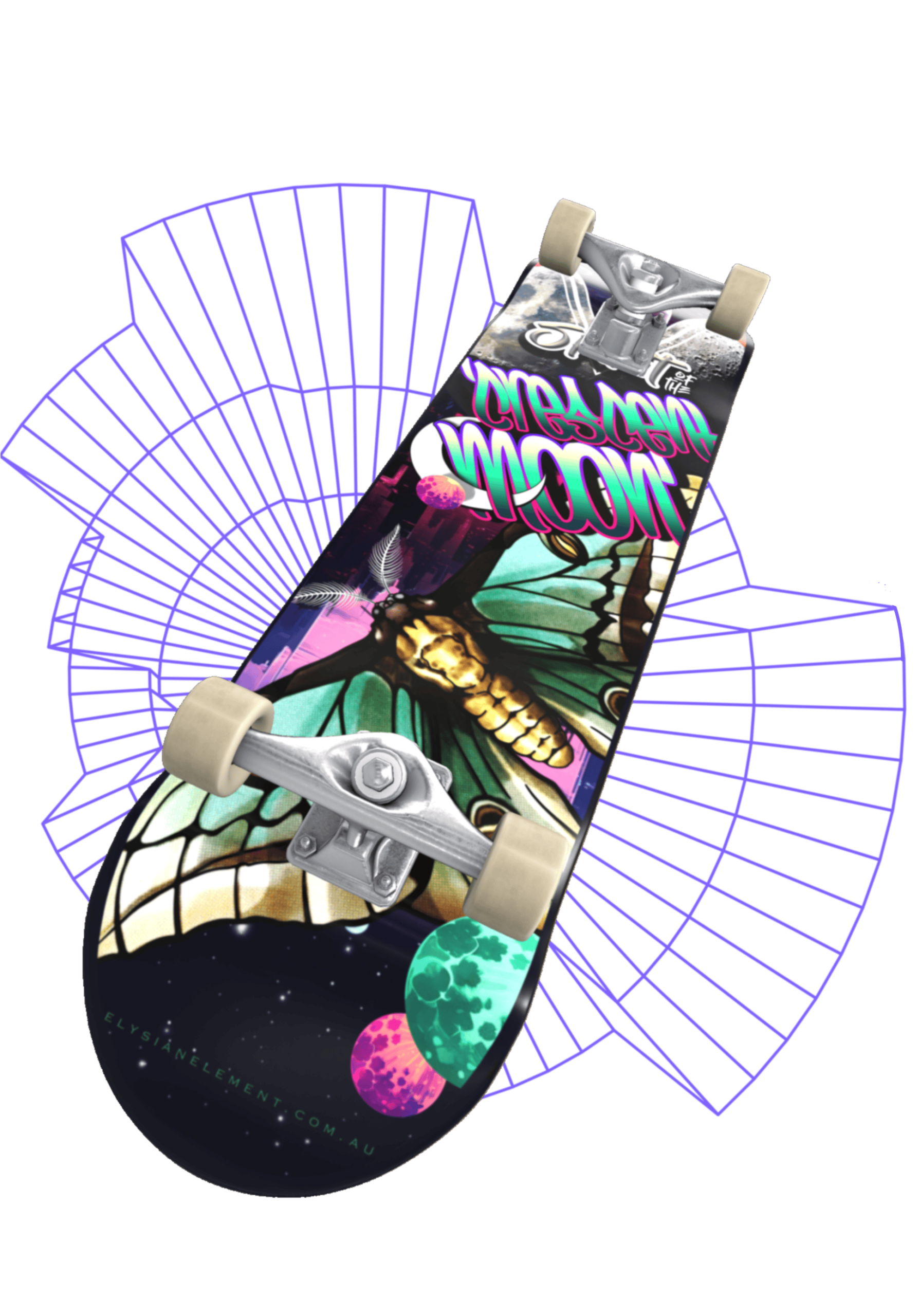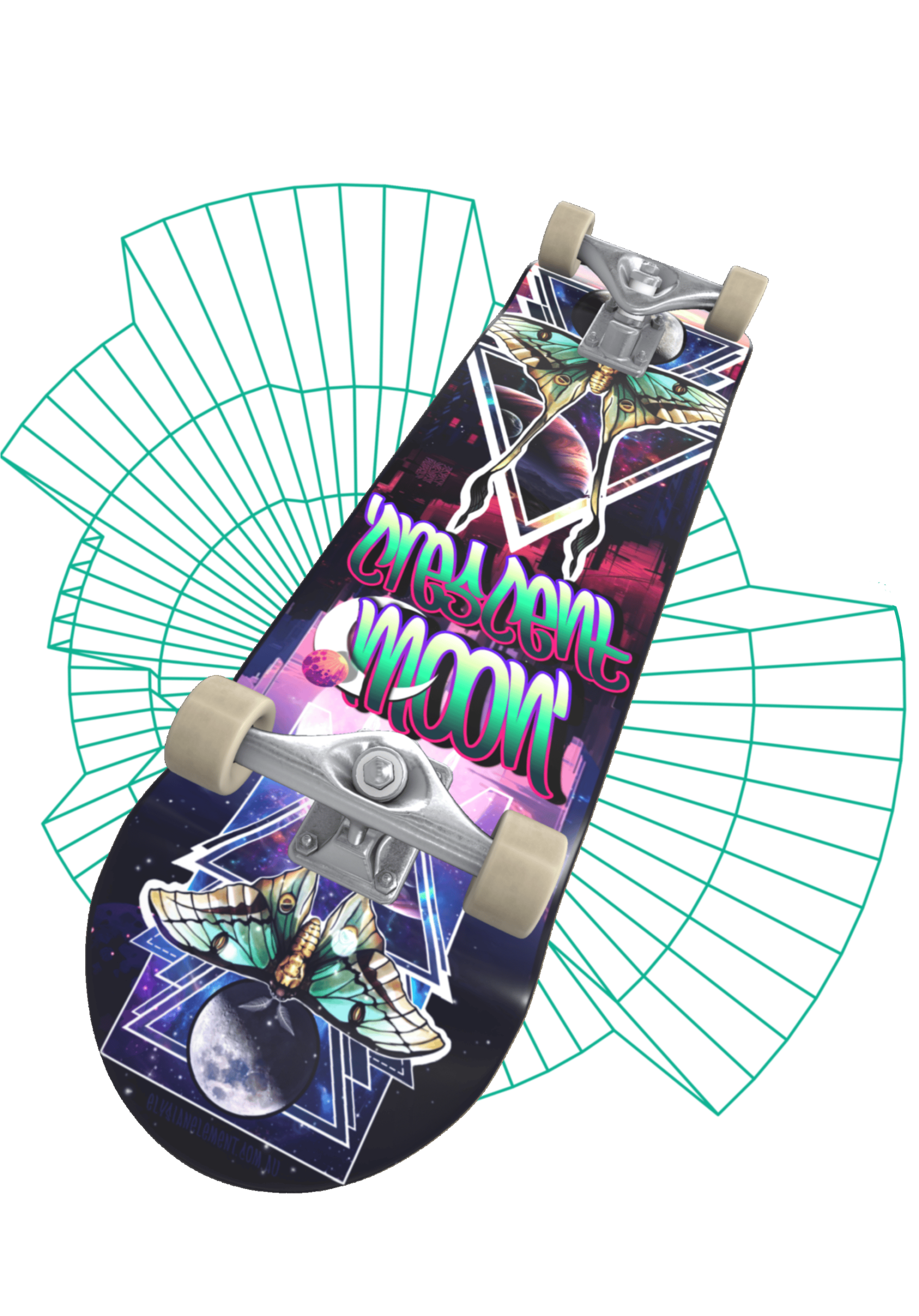 This custom skateboard wall art piece features a luna moth draped in delicate beads and gem stones, peacefully perched atop a stunning geometric-framed galaxy backdrop. Designed digitally for application to a skateboard deck, once finished, the final design is precision printed on high quality adhesive laminate vinyl. Only when the deck is smooth and clean of debris, is it then applied to a blank skateboard deck and mounted as a decorative wall display.
