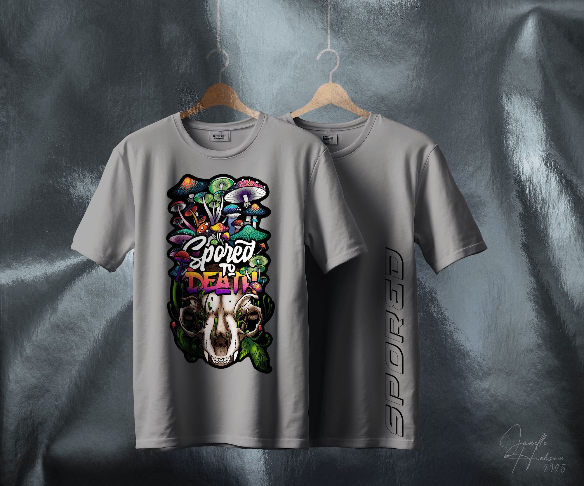‘Spored to Death-Digital Art- by Janelle Hickson is a captivating and chaotic exploration of macabre beauty. A cat skull, rendered in vibrant, saturated hues, serves as the centerpiece, from which a profusion of mushrooms erupts in a surreal and unsettling display. The words “spored to death” are centrally positioned, adding to the piece’s darkly whimsical atmosphere. Hickson’s masterful use of digital techniques creates a vivid, almost hallucinatory effect, blending dark ethereal elements with curious oddities. This piece, available on wearable garments and other printable mediums, marks the beginning of a series exploring this unique and unusual theme.