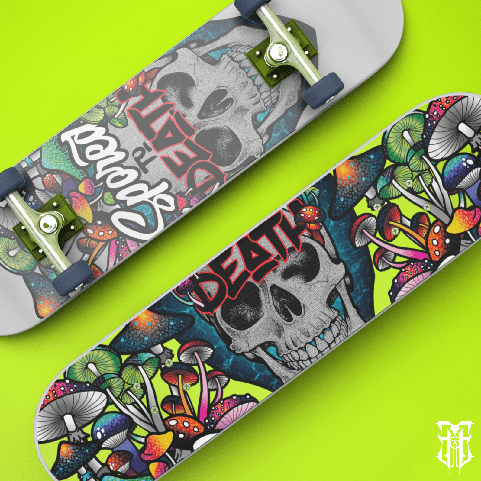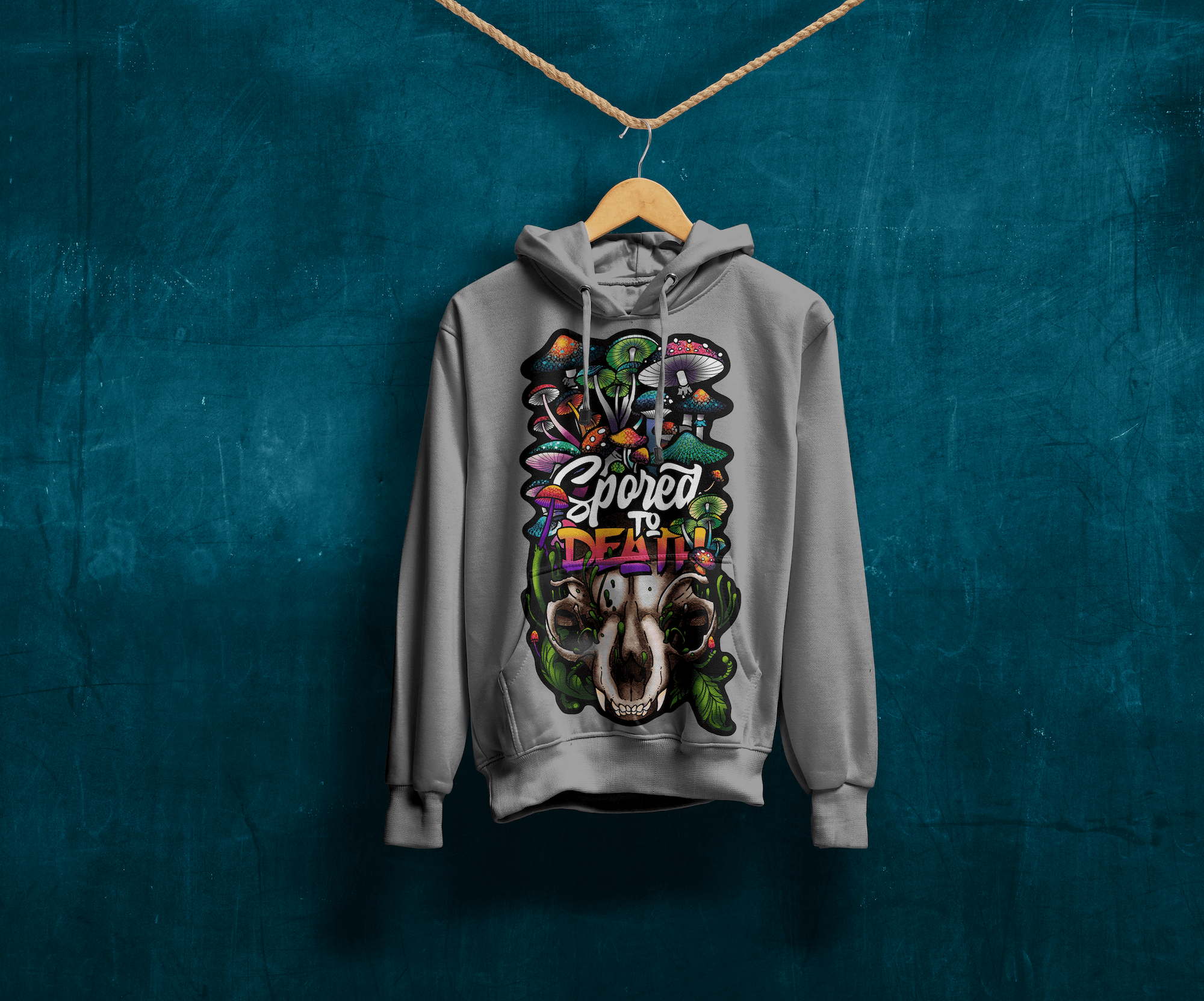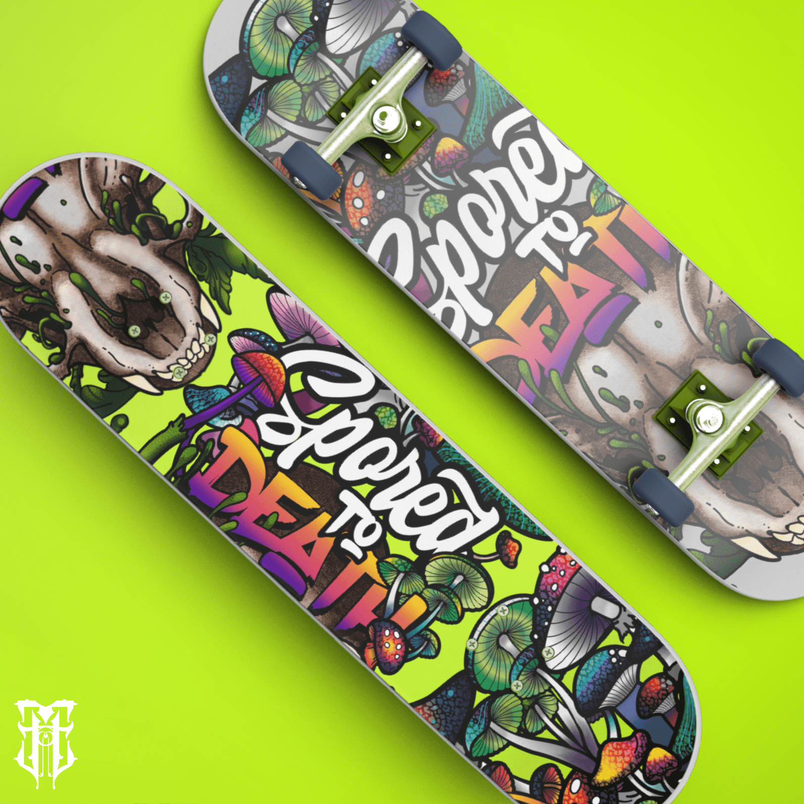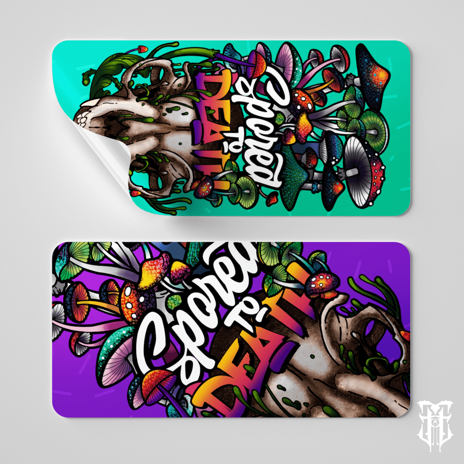 Spored to Death is a vivid exploration of macabre beauty, blending death, decay, and psychedelic growth into a single chaotic vision. At its core lies a skull, rendered in bold, saturated colours, acting as both symbol and soil for an eruption of mushrooms spiralling upward in wild profusion.
