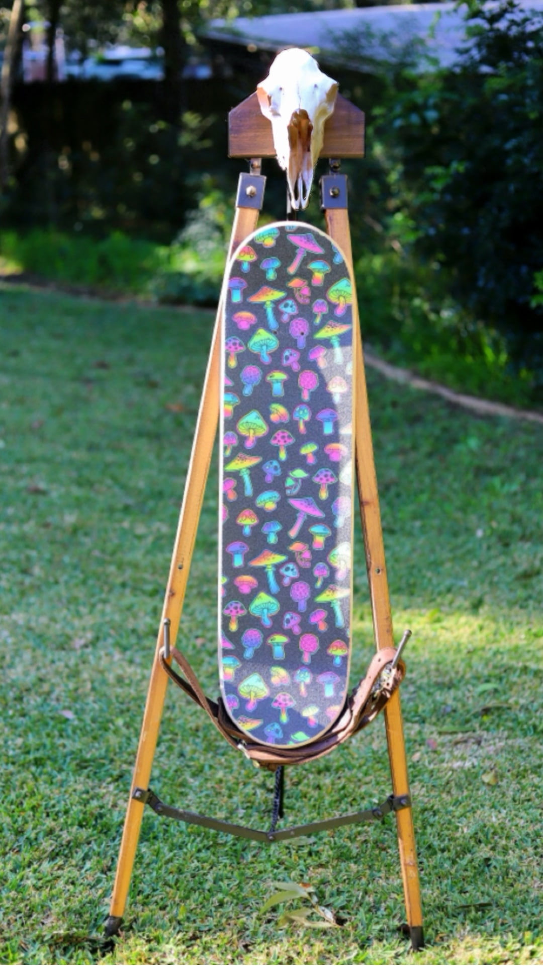 Crafted for those who live between the skatepark and the surreal, this wall art piece blends gremlin grit with psychedelic charm. A fanged Animal skull sprouts mushrooms from its crown, — a fitting theme for the bone baddies and their fungi friends. Whether you’re decking out a bedroom, studio, or board shop, this piece commands attention and sparks conversation.